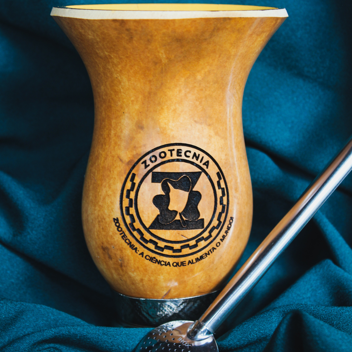 Uma cuia produzida com material orgânico com o símbolo da Zootecnia sendo um produto artesanal e sustentável, ideal para representar a identidade profissional de zootecnistas, especialmente no contexto da cultura gaúcha e do consumo de chimarrão.